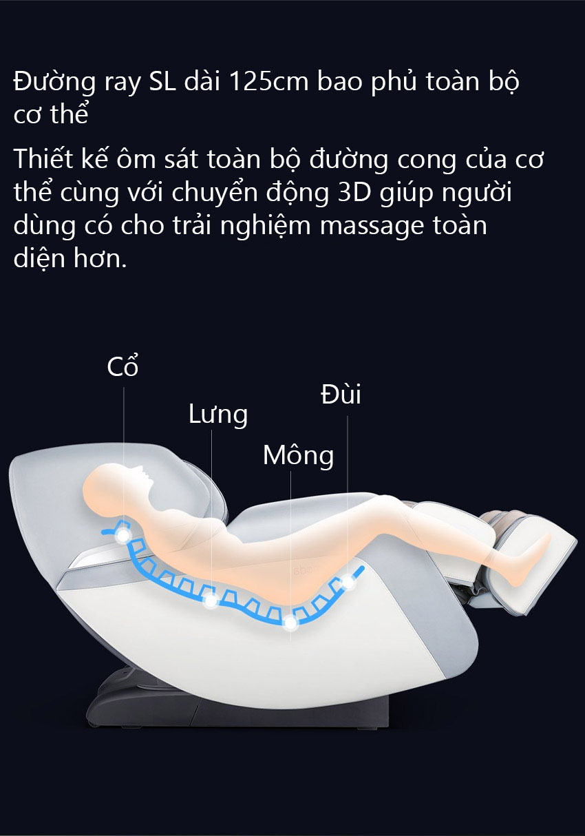 Ghế massage thông minh Xiaomi Momoda RT5870 được thiết kế đường ray dạng SL siêu dài 125cm, bao phủ toàn bộ đường cong sinh lý cơ thể. Cụ thể hệ thống đường ray chữ S phù hợp với đường cong cột sống và giảm căng cơ ở mức độ sâu. Còn đường ray chữ L cho hiệu quả kéo dài hành trình massage đến các cơ mặt sau của đùi, để thư giãn các cơ bị căng do hoạt động nhiều, thể thao quá mức, điều này giúp cho cơ thể người dùng trải nghiệm massage một cách tốt nhất