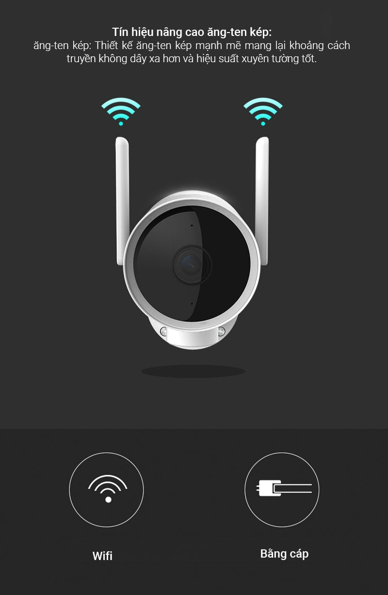 Ăng-ten kép cung cấp tín hiệu mạnh, ổn định và không bị gián đoạn bởi ngay cả những bức tường dày nhất. Camera an ninh ngoài trời Xiaomi IMILAB EC3 có thể hoạt động cả từ kết nối cố định bằng cáp cũng như sử dụng kết nối Wifi không dây.