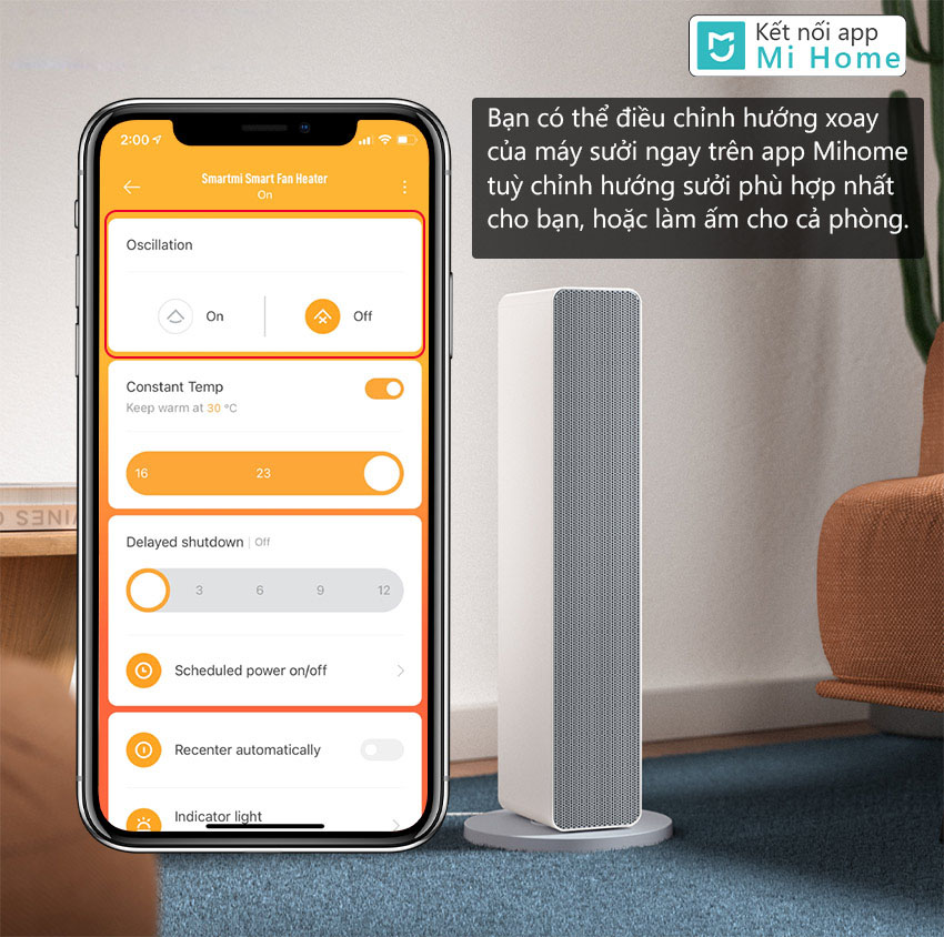 Người dùng có thể kết nối với App Mi Home tải trên kho ứng dụng. Tạo tài khoản là hoàn toàn có thể điều khiển từ xa ở bất cứ nơi đâu. Trước khi bạn về nhà khoảng 15 phút, bạn chỉ cần mở app và khởi động để chúng hoạt động an toàn. Về tới nhà cũng là lúc, thành quả từ máy sưởi một không gian ấm áp giành cho gia đình bạn. Đặc biệt với kết nối app bạn có thể cài đặt nhiệt độ làm ấm chính xác theo nhu cầu của mình(Tối đa là 30o ), và bật tính năng duy trì một nhiệt độ nhất định giúp cho căn phòng luôn luôn được giữ ấm ở mức nhiệt độ phù hợp với bạn.