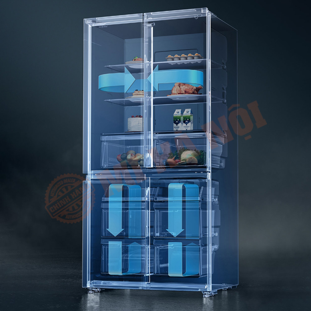 Tủ lạnh bốn cánh Xiaomi Mijia 606l áp dụng công nghệ làm mát bằng không khí và làm lạnh thông minh bằng dàn thoát hơi giúp giải quyết vấn đề đông đá ở tủ lạnh truyền thống.